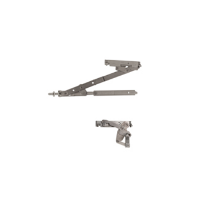 Il kit, composto da cerniere a scomparsa e braccio corto, consente l' apertura dell'anta a 180° e si monta interamente a contrasto su tutti i profili a camera europea. La cerniera inferiore, regolabile in 3D, è composta da una base in zama e un innovativo sistema di leve in acciaio ad alta resistenza. Il braccio superiore è d'acciaio inox ed è integrato con la cerniera superiore. Il sistema di leve, brevettato, è privo di asole garantendo in questo modo una maggiore resistenza ed evitando al tempo stesso l'usura meccanica da scorrimento. Impiegabile su finestre con larghezza da 422 a 900mm, è adatto anche agli infissi integrati nelle facciate continue.