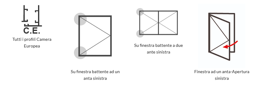 Le cerniere consentono l'apertura dell'anta a 180° e si montano, interamente a contrasto, su tutti i profili a camera europea. La cerniera inferiore, regolabile in 3D, è composta da una base in zama e un innovativo sistema di leve in acciaio ad alta resistenza. La cerniera superiore, anch'essa d'acciaio, è dotata di un sistema di aggancio rapido all'anta. Il sistema di leve, brevettato, è privo di asole garantendo in questo modo una maggiore resistenza ed evitando l'usura meccanica da scorrimento.