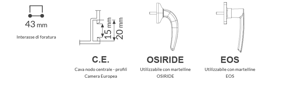 Meccanismo interno monodirezionale da impiegarsi in abbinamento con le martelline OSIRIDE. Il corpo e i meccanismi sono in zama, la rotazione del manico è di 180° gradi.