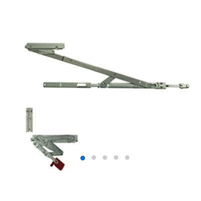 Il kit, composto da cerniere a scomparsa e braccio lungo, consente l' apertura dell'anta a 180° e si monta interamente a contrasto su tutti i profili a camera europea. La cerniera inferiore, regolabile in 3D, è composta da una base in zama e un innovativo sistema di leve in acciaio ad alta resistenza. Il braccio superiore è d'acciaio inox ed è integrato con la cerniera superiore. Il sistema di leve, brevettato, è privo di asole garantendo in questo modo una maggiore resistenza ed evitando al tempo stesso l'usura meccanica da scorrimento. Impiegabile su finestre con larghezza da 700 a 1700mm, è adatto anche agli infissi integrati nelle facciate continue.