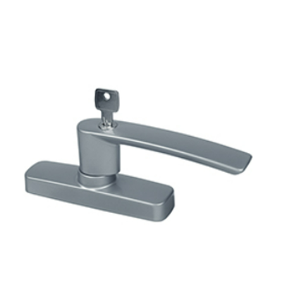Cremonese ad una uscita, interamente in alluminio pressofuso e verniciato, con selettore a chiave per rotazione del manico a 90° e 180°. Corpo e manico in alluminio pressofuso, pignone e molle in acciaio zincato, cremagliera in acciaio inox, piastrina inferiore in nylon. Contropiastre autobloccanti in acciaio inox.